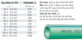 Thông số kỹ thuật Ống nước PPR K2 PN16